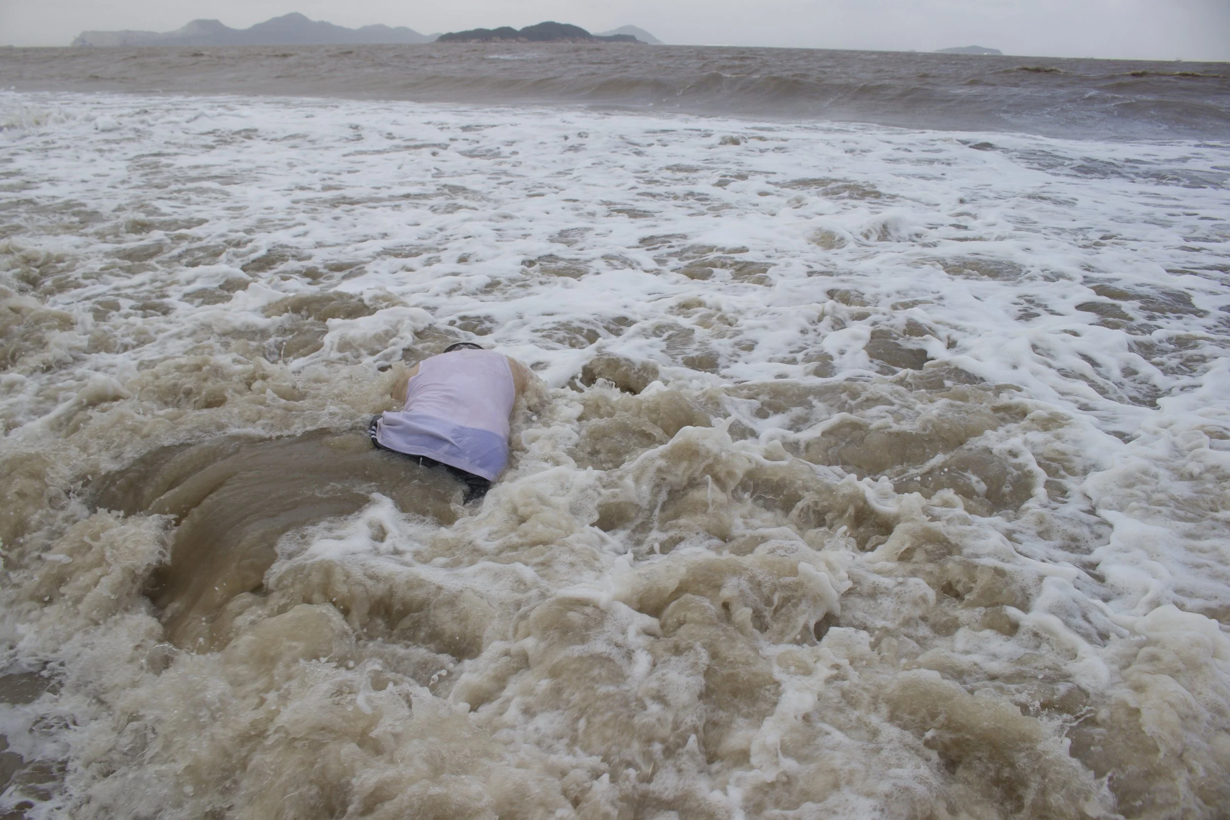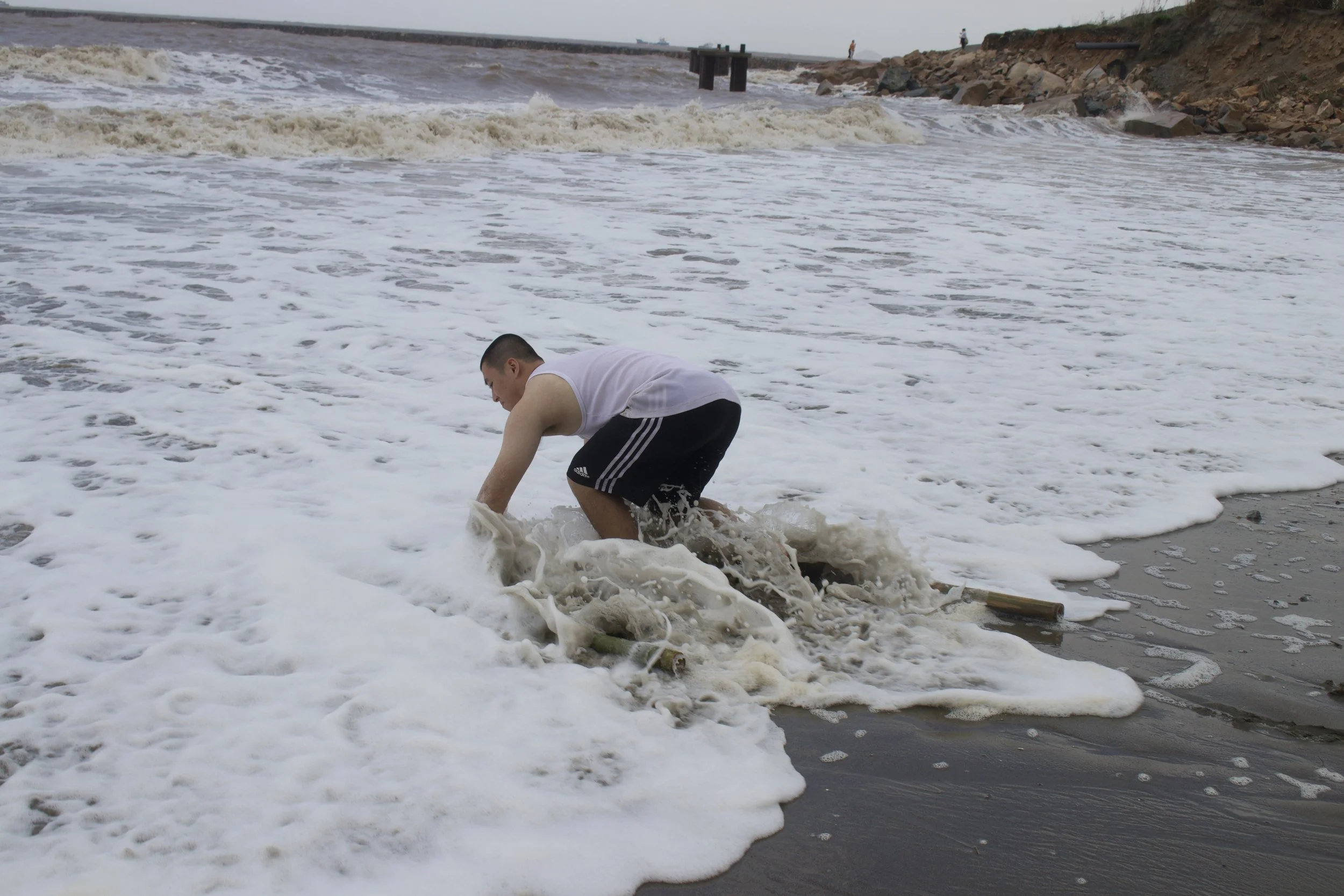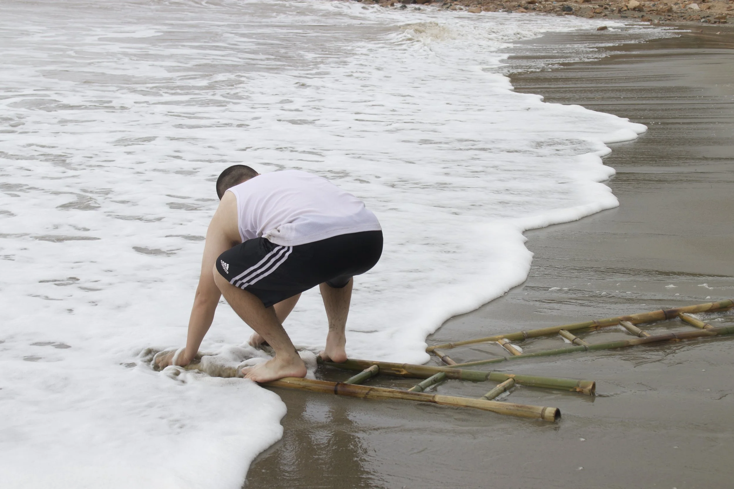 The bamboo ladder on the beach forms a path across the sea, but the impact of the waves and the buoyancy of the ladder make it more difficult to go forward.