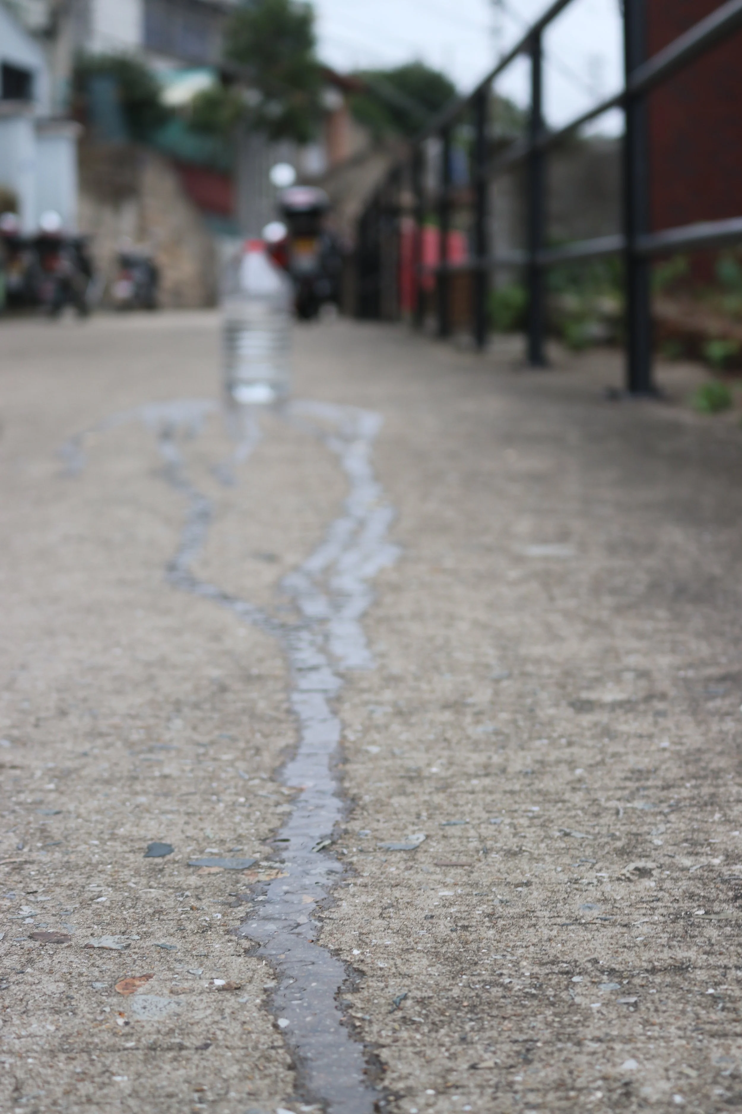 I loaded a bucket of water from the sea and carried it towards the top of the mountain. Then, I poured a small part of it each time starting from the top and let the water flow down the slope. I repeat the action where the water stops. The trail of water extends from the top of the mountain to the sea. Finally, the water reached the sea through the steps of the pier at the port while the first few traces already evaporated in the air.